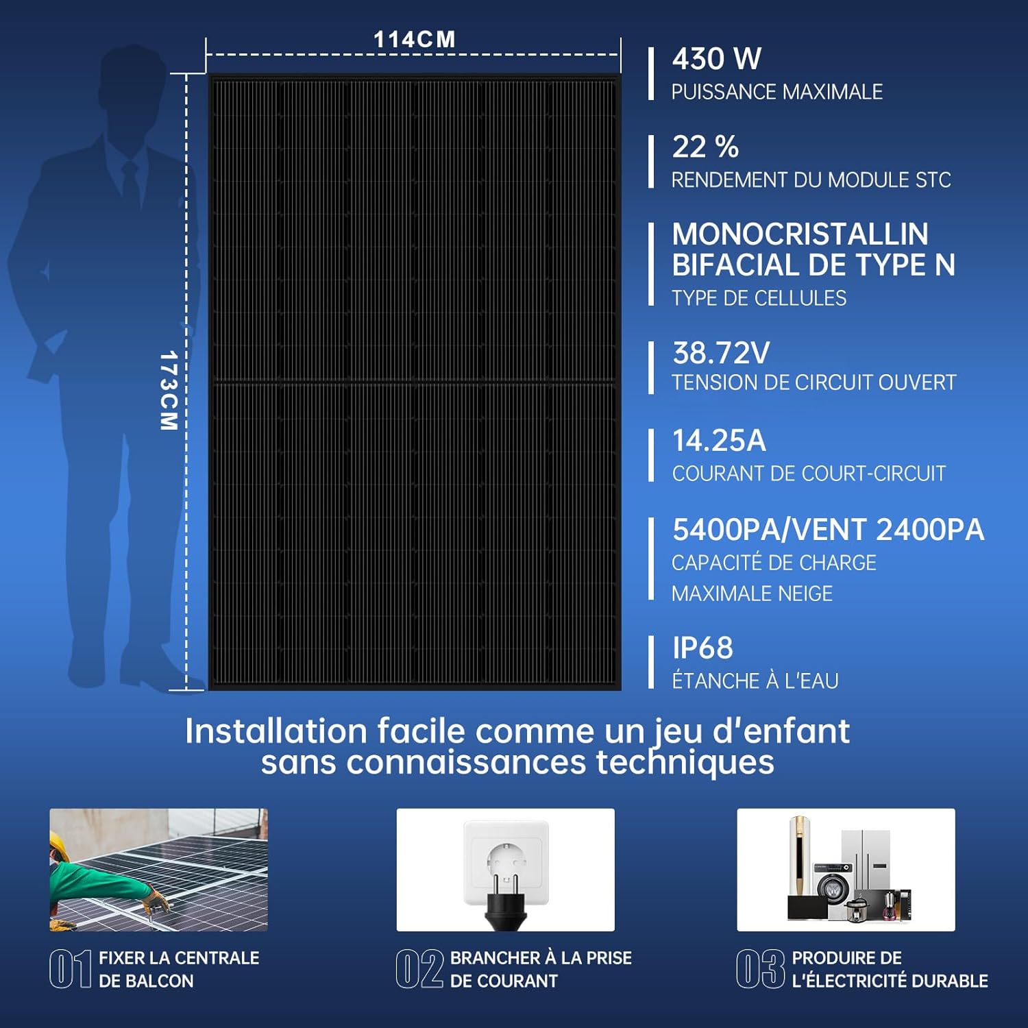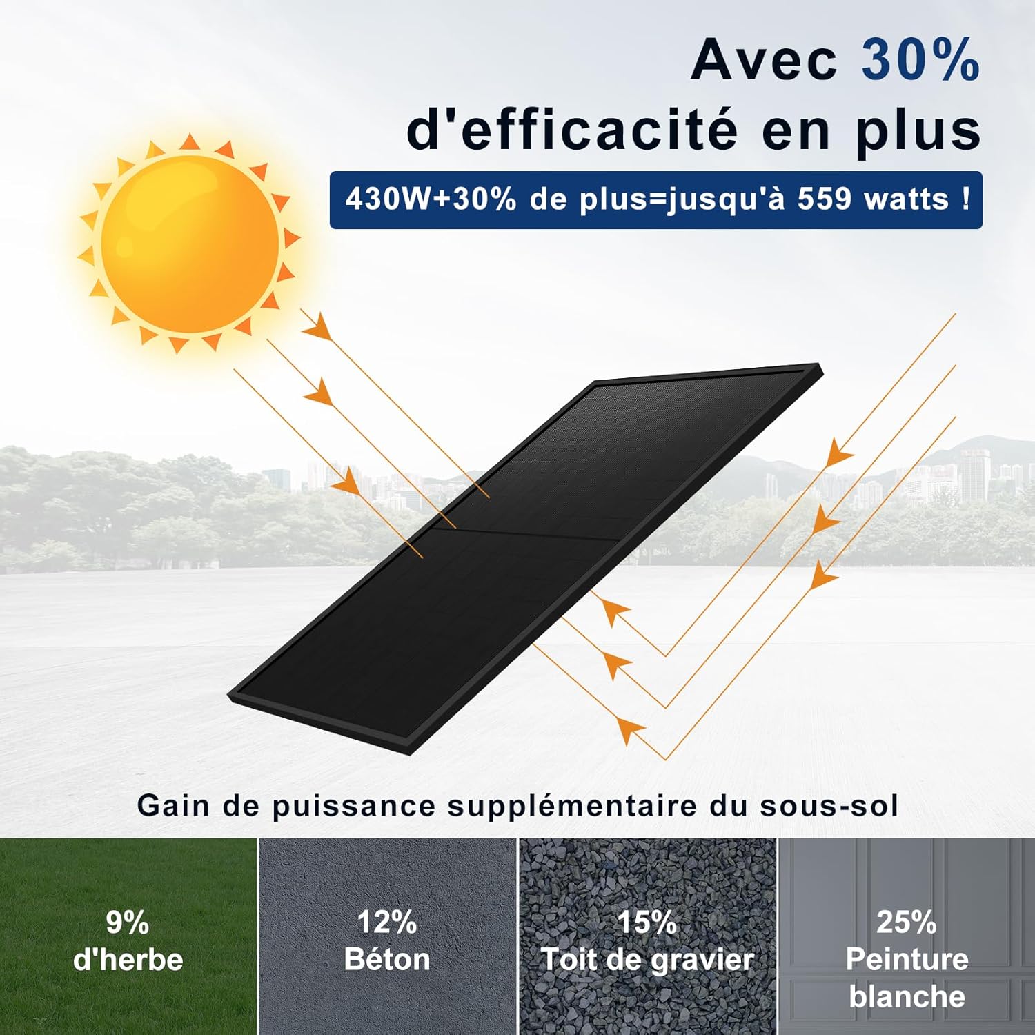 ✅ [Performance Optimale] Profitez d’un rendement énergétique accru grâce à nos panneaux solaires de 430W. Avec une efficacité pouvant atteindre 22 %, ces modules exploitent également la lumière réfléchie sur leur face arrière, offrant jusqu’à 30 % de production supplémentaire sur une même surface. Une solution idéale pour maximiser votre production d’énergie, que ce soit pour un usage domestique ou professionnel.